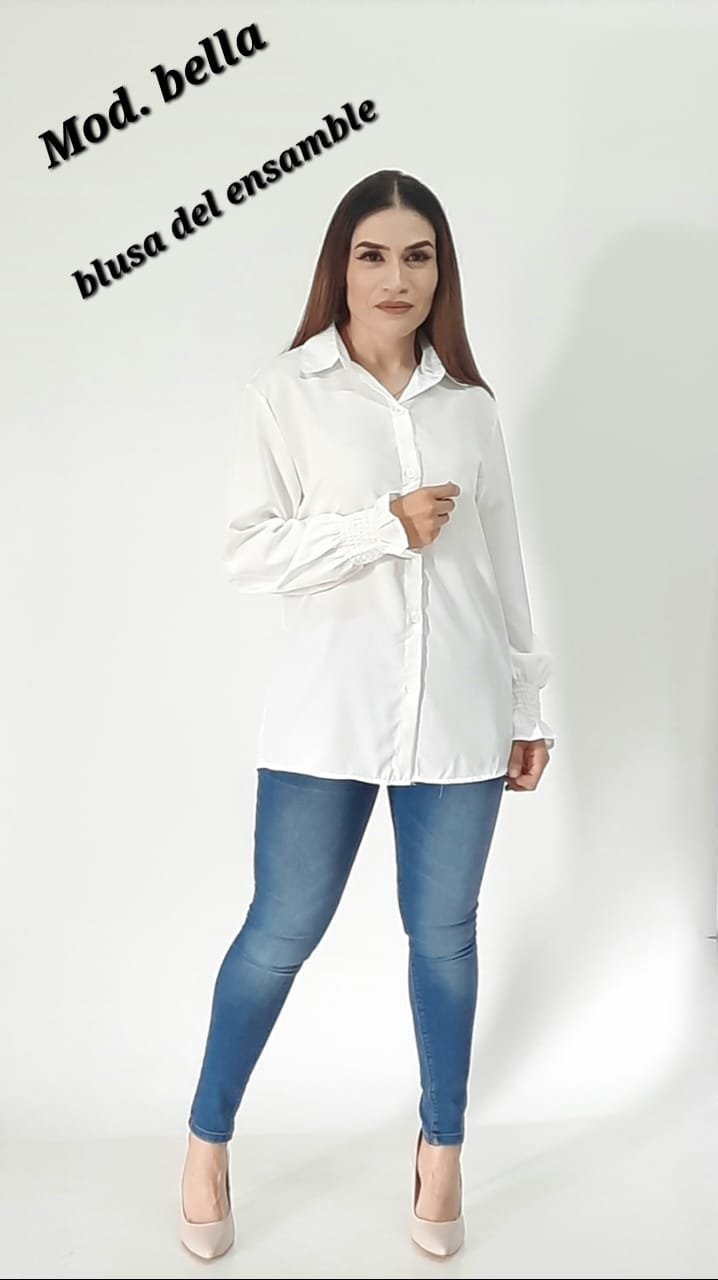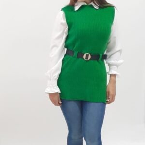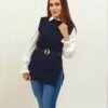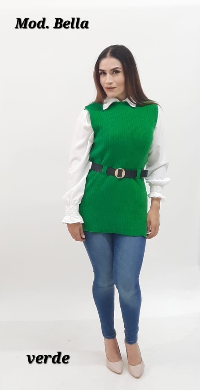 CHALECO TEJIDO CON BLUSA DE VESTIR Y CINTO INCLUIDO.